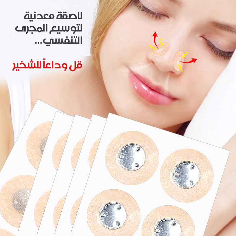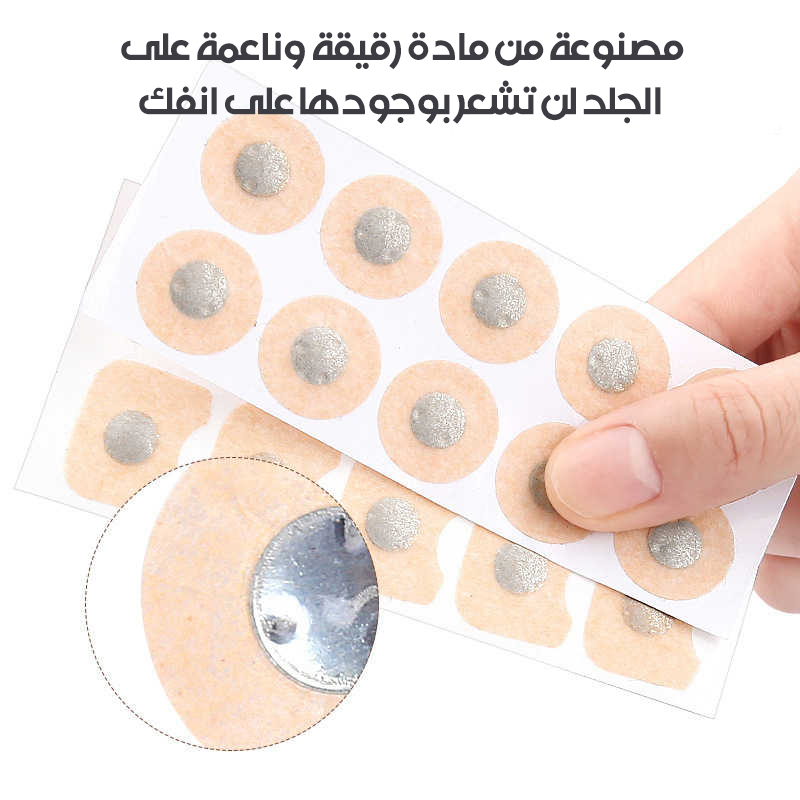 يأتي مع الملصقات مشبك مغناطيسي خارجي لتوصيل الملصق يمين ويسار الانف مع بعضهم البعض بشكل طبيعي وفعال دون ألم.